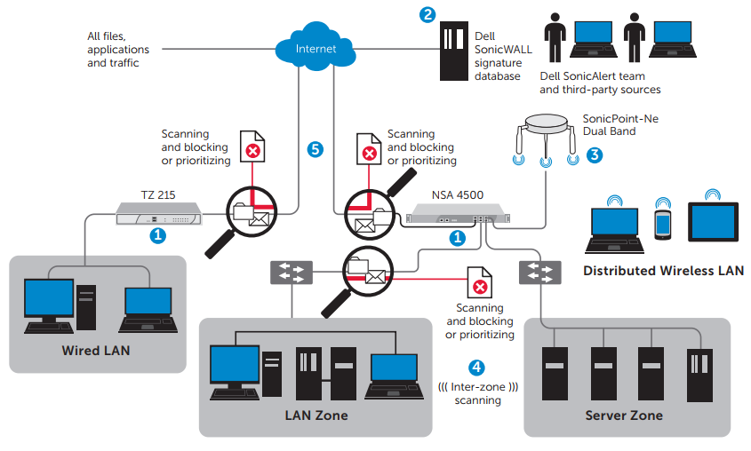 - Inter-zone scanning delivers protection not only between each network zone and the Internet, but also between internal network zones