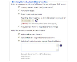 SonicWall includes several other techniques in its connection management module. Enabling BATV ensures that NDR or Blowback spam is blocked. Directory Harvest Attack protection deletes, rejects or stores in a junk box, messages to users not listed in LDAP.
